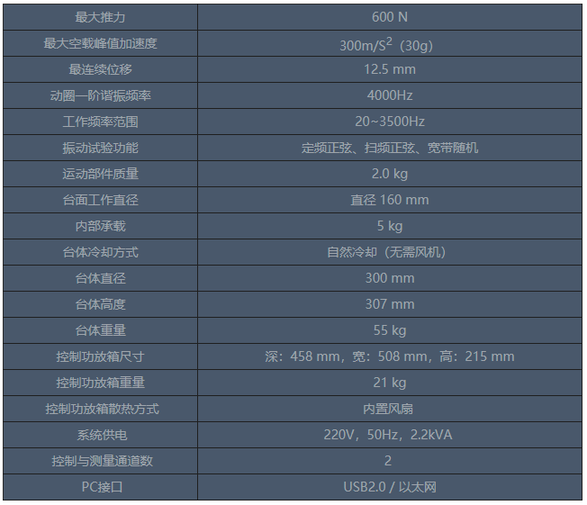桌面上的振動(dòng)臺(tái)。220V供電。自然冷卻(無(wú)需風(fēng)機(jī))。適合2kg以下試件。正弦、隨機(jī)振動(dòng)。主要技術(shù)參數(shù)表
